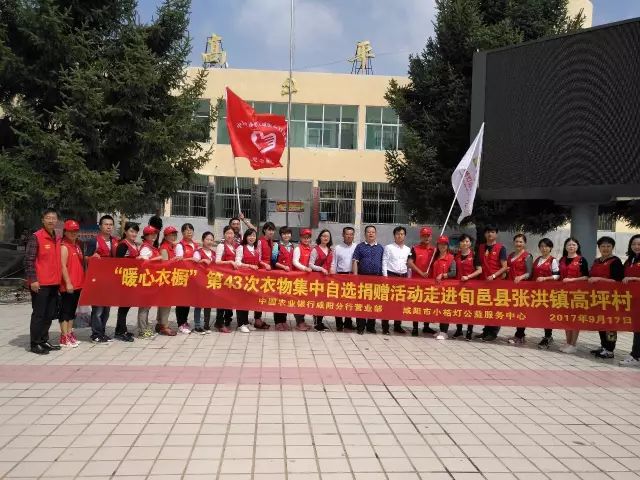 9月17日上午,由中国农业银行咸阳分行营业部志愿者服务队、咸阳市食品药品稽查支队、咸阳市小桔灯公益服务中心联合举办的“暖心衣橱”第43次衣物集中自选捐赠活动在旬邑县张洪镇高坪村顺利开展,共有26名志愿者参与了本次志愿服务活动。