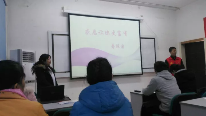 小桔灯公益负责人郭恩伟在开课前介绍了培训老师并以一句“感恩让我们的生活更快乐”描述了感恩教育的重要性。之后在热烈的掌声中鲁老师开始了本次讲座。