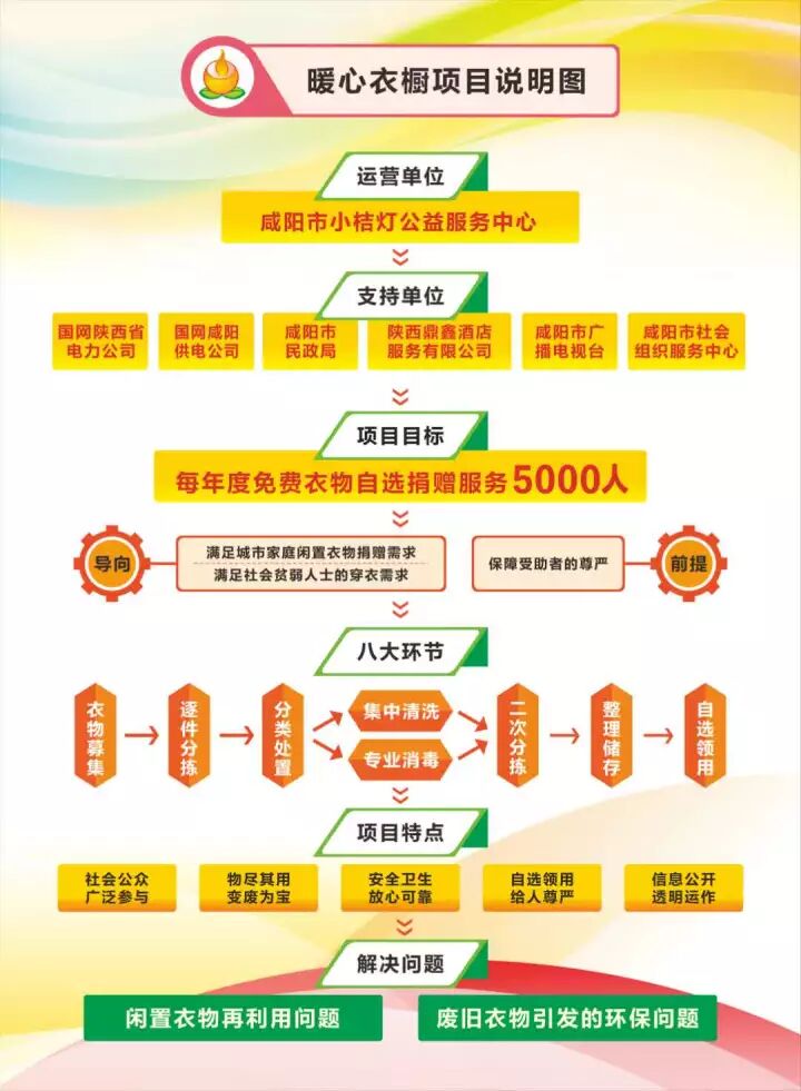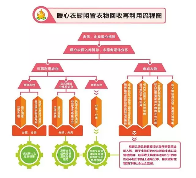 “暖心衣橱”大型闲置衣物回收再利用公益项目是小桔灯公益的品牌项目,该项目通过衣物募集、逐件分拣、分类处置、集中清洗、专业消毒、二次分拣、整理储存、自选领用等八大环节形成一套完整的闲置衣物回收再利用慈善公益产业链。
